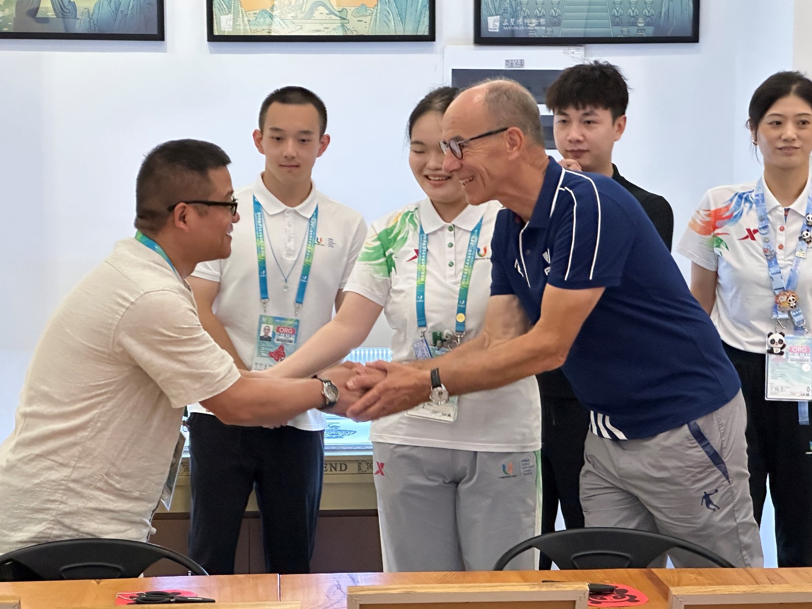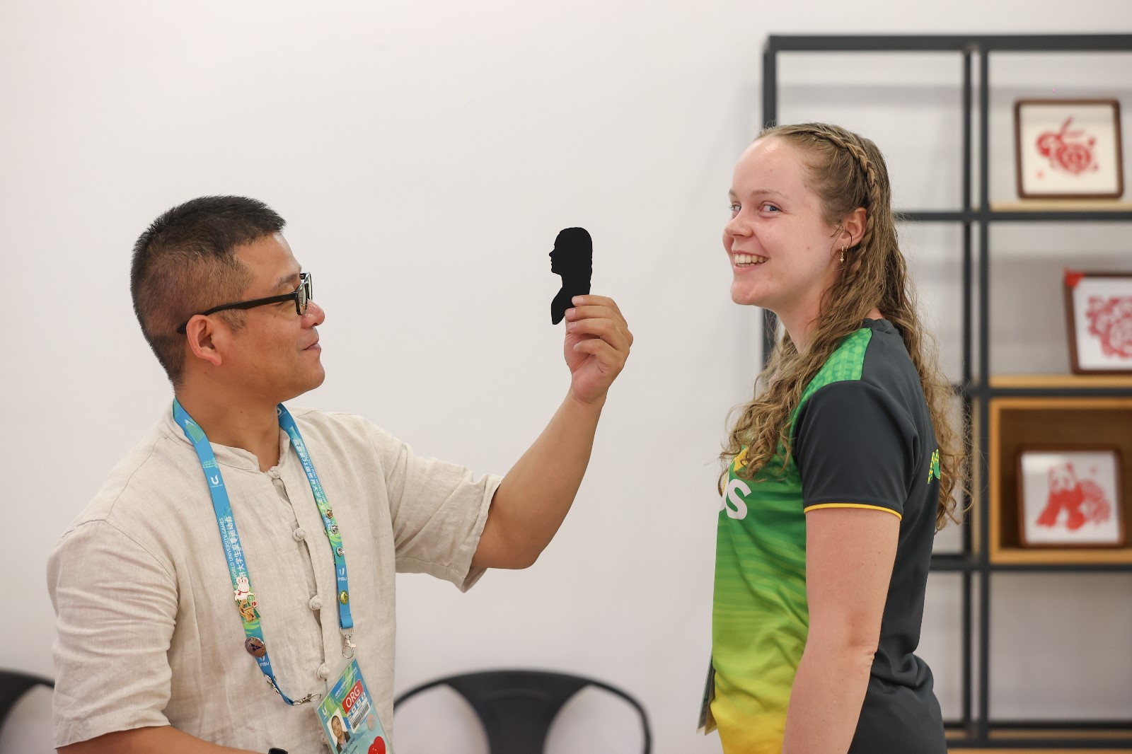 莊叢燦的剪影作品和其耐心負(fù)責(zé)的剪紙教學(xué)倍受運(yùn)動(dòng)員們“點(diǎn)贊好評(píng)”的同時(shí),也吸引了國(guó)際大體聯(lián)和各國(guó)代表團(tuán)人員前來(lái)“沉浸式體驗(yàn)”。期間,莊叢燦為國(guó)際大體聯(lián)代理主席雷諾·艾德和意大利代表團(tuán)官員彼得羅·伊瓦爾迪進(jìn)行剪紙教學(xué)和剪影留念。