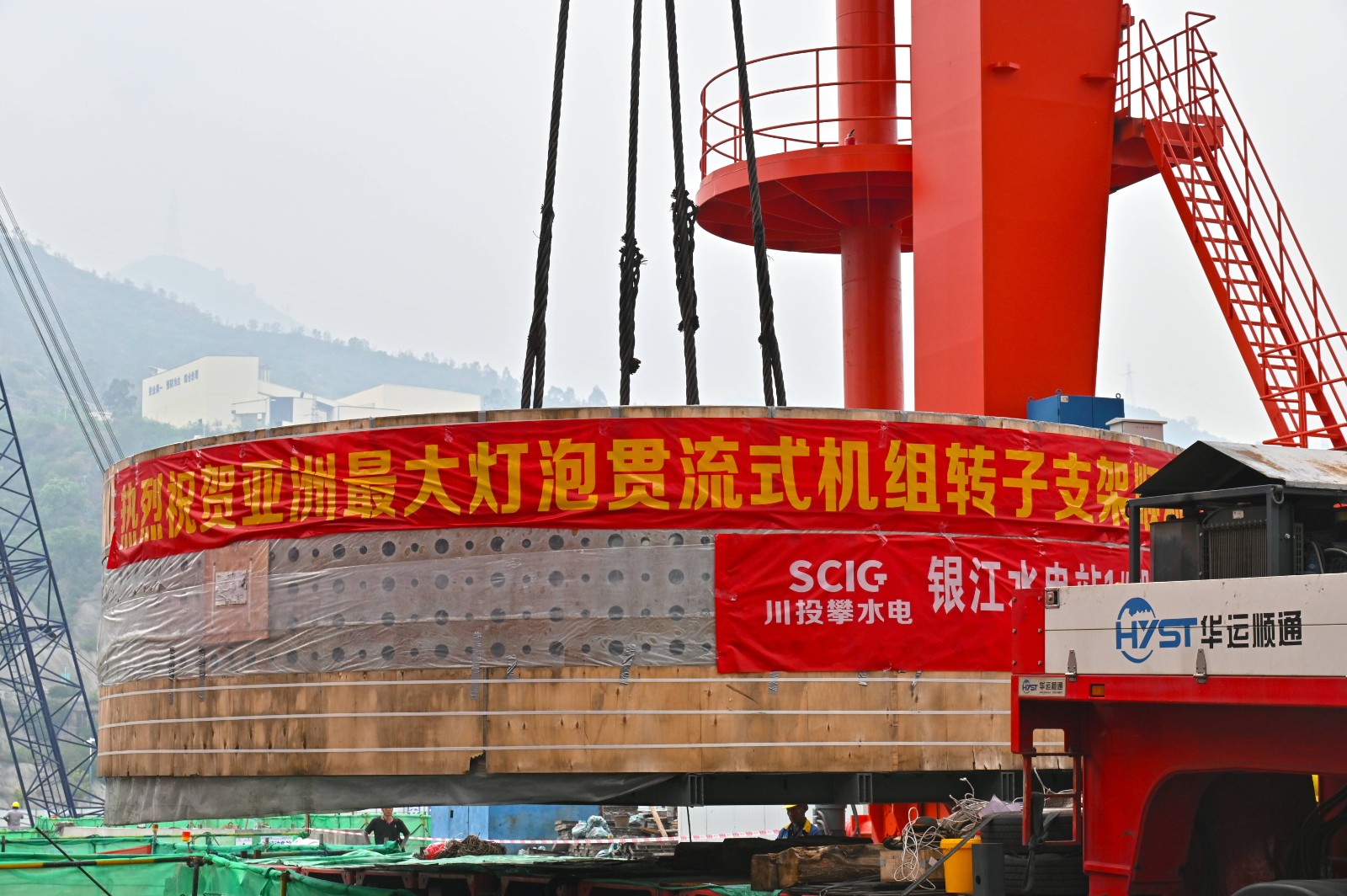 當(dāng)日上午,攀水電公司和參建單位職工齊聚壩頂,共同迎接歷經(jīng)艱難、遠(yuǎn)道而來的“重要成員”。據(jù)攀水電公司相關(guān)負(fù)責(zé)人介紹,該轉(zhuǎn)子支架具有設(shè)備巨大、運輸困難、作用重要三個特征。設(shè)備之“重”。轉(zhuǎn)子支架直徑達(dá)8米,高2米有余,重達(dá)百余噸,是目前亞洲最大的燈泡貫流式機(jī)組轉(zhuǎn)子支架。運輸之“難”。轉(zhuǎn)子支架于4月22日從江蘇鎮(zhèn)江碼頭開始運輸,先乘船再坐車,途中克服了大件超寬超限、持續(xù)降雨、道路塌方等諸多不利因素,多次調(diào)整運輸路線,風(fēng)雨無阻,日夜兼程,歷時66天,跨越7個省份,全程3062公里,在沿途交警的護(hù)送下安全抵達(dá)。作用之“要”。轉(zhuǎn)子支架作為機(jī)組的核心部件,為磁軛一體圓盤式結(jié)構(gòu),中心體采用整圓鍛鋼與磁軛圈焊接組成,對轉(zhuǎn)子磁軛垂直度、磁軛圓度等加工精度要求極高,決定著機(jī)組的運行性能、運行效率和安全穩(wěn)定性。