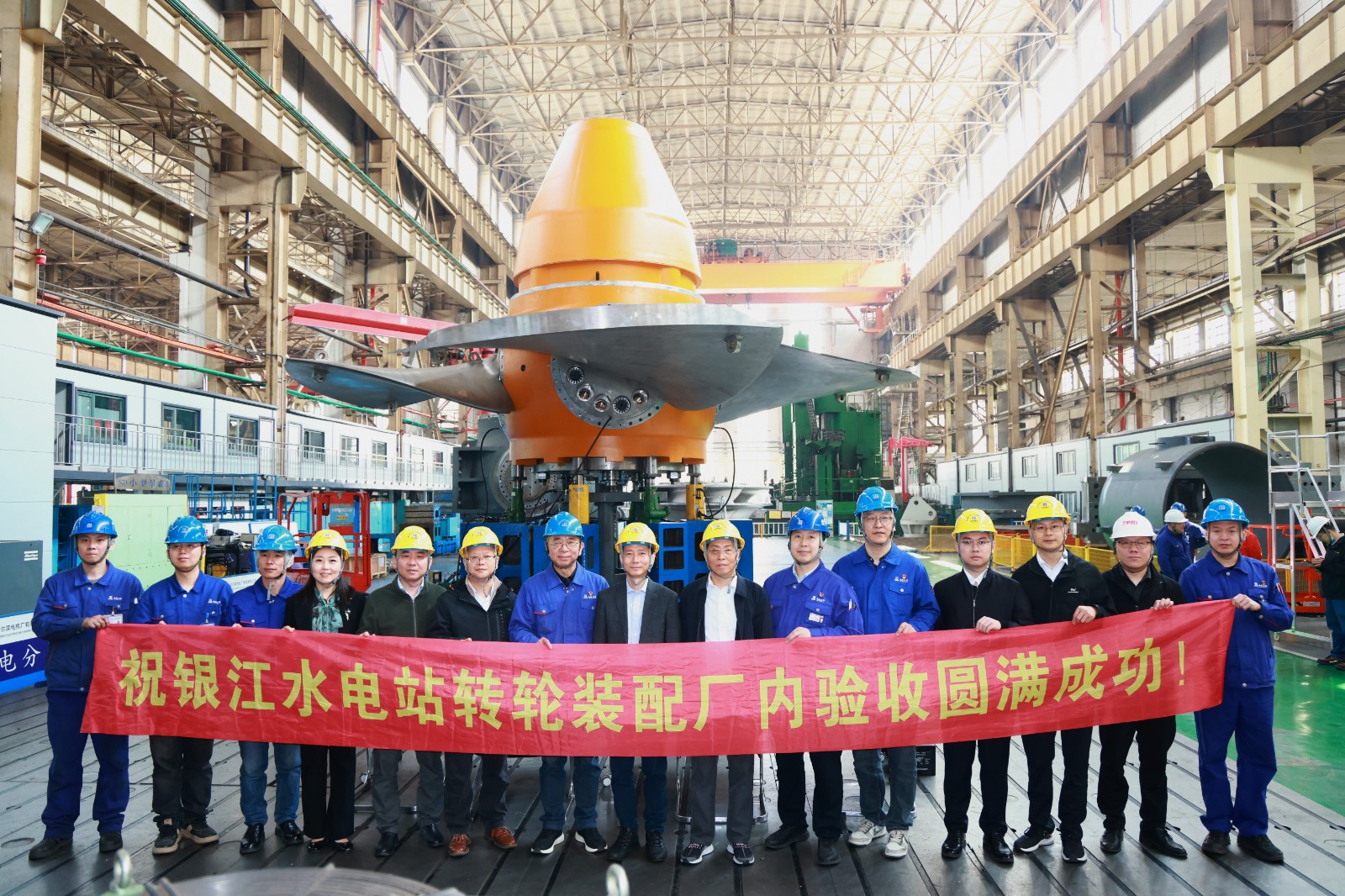 轉輪是水力發(fā)電機組的核心部件之一。銀江水電站安裝有6臺單機容量為6.5萬千瓦的水輪發(fā)電機組,所采用的轉輪具有設計難度大、制造難度高等特點。為確保銀江水電站的工程建設進度,27日當天,在哈電集團哈爾濱電機廠內,驗收組依據(jù)設計圖紙、技術規(guī)范及行業(yè)標準,對轉輪本體尺寸精度、焊縫質量、動平衡試驗數(shù)據(jù)、槳葉預裝配合度等12項核心技術指標進行了現(xiàn)場實測與資料復核。經(jīng)多維度綜合評定,轉輪裝配各項技術參數(shù)均符合設計規(guī)范要求,設備制造質量達到優(yōu)良標準,交貨進度滿足項目節(jié)點計劃,順利完成驗收。