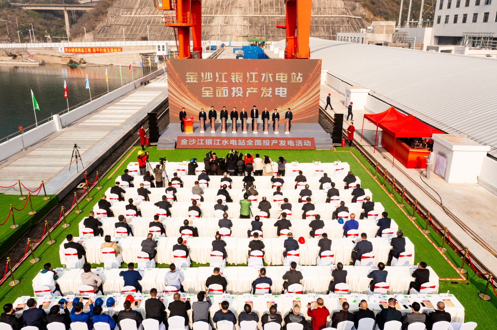 12月19日上午11時,四川能源發(fā)展集團金沙江銀江水電站全面投產(chǎn)發(fā)電活動在電站大壩上舉行,四川省國資委黨委委員、副主任張敏,攀枝花市政府黨組成員、副市長許軍峰,四川省能源局副局長曾光,四川能源發(fā)展集團黨委副書記、副董事長、總經(jīng)理鄧超出席活動并致辭,集團黨委委員、副總經(jīng)理楊陽主持活動,總經(jīng)理助理、川投能源黨委書記劉勝金出席活動。
