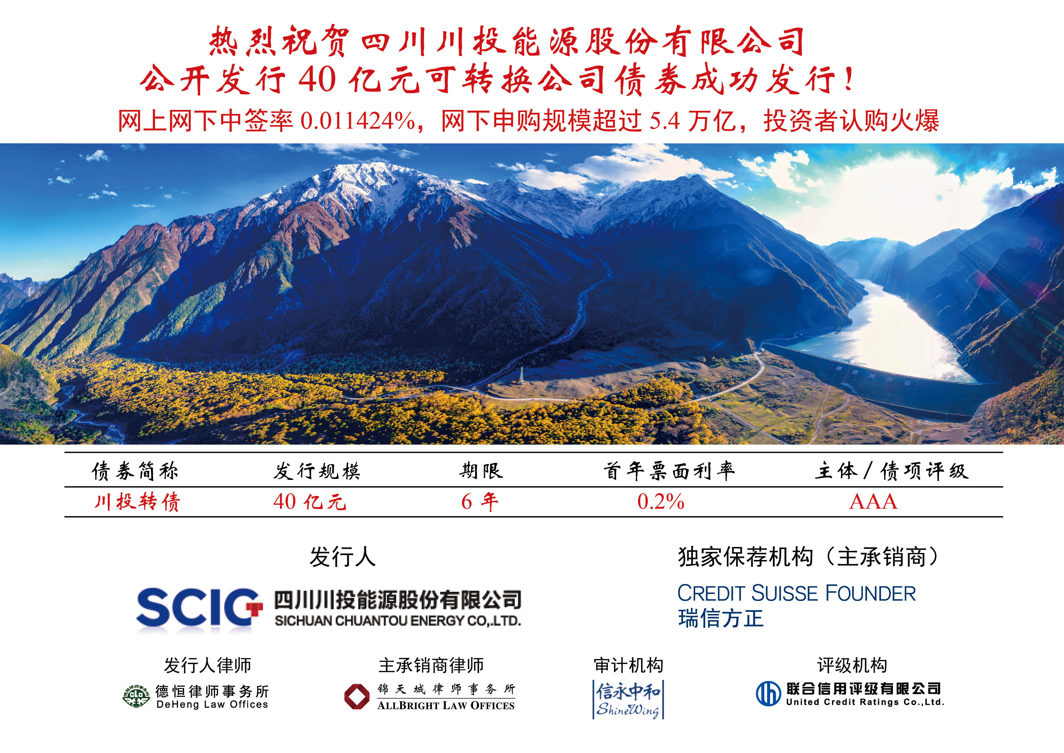 2019年11月15日,四川省投資集團(tuán)有限責(zé)任公司(簡(jiǎn)稱“川投集團(tuán)”)控股四川川投能源股份有限公司(簡(jiǎn)稱“川投能源”,600674.SH)公開發(fā)行A股40億元可轉(zhuǎn)換公司債券工作取得圓滿成功!40億元募集資金已全額到賬!這不僅是川投能源歷史上規(guī)模最大的一次融資,更標(biāo)志著川投集團(tuán)控股的川投能源上市公司6年資本市場(chǎng)融資工作實(shí)現(xiàn)破冰。對(duì)于川投集團(tuán)和川投能源優(yōu)化融資債務(wù)結(jié)構(gòu),做優(yōu)做強(qiáng)做大能源主業(yè),以及促進(jìn)四川省國(guó)有企業(yè)借助資本市場(chǎng)實(shí)現(xiàn)高質(zhì)量發(fā)展意義重大!