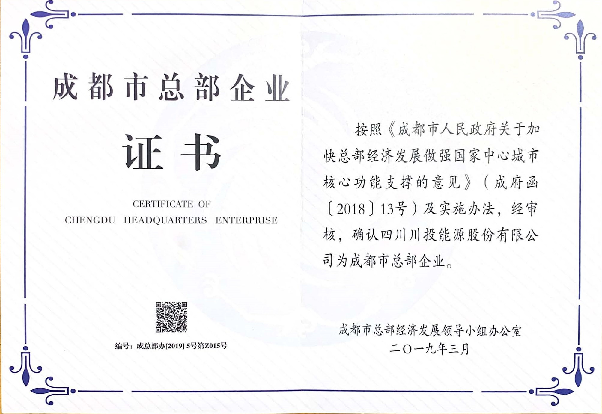 日前,從成都市總部經(jīng)濟(jì)發(fā)展領(lǐng)導(dǎo)小組辦公室處傳來(lái)喜訊,經(jīng)審核確認(rèn),川投能源正式通過(guò)2018年成都市第二批總部企業(yè)資質(zhì)認(rèn)證授牌,獲頒“成都市總部企業(yè)證書”,為2019年經(jīng)營(yíng)管理工作再添亮點(diǎn)。
