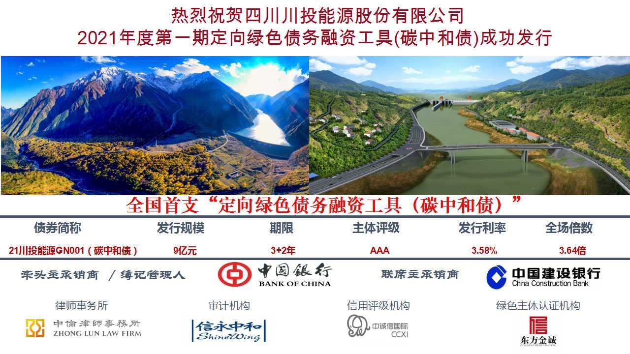 2021年7月15日,四川川投能源股份有限公司成功發(fā)行2021年度第一期定向綠色債務(wù)融資工具(碳中和債)(簡(jiǎn)稱:21川能投GN001,代碼:q21071406.IB),本次發(fā)行金額9億元,期限3+2年,票面利率3.58%,屬目前同期限同定向債務(wù)融資工具的全國(guó)最低價(jià)格。募集資金將專項(xiàng)用于收購?fù)ぷ涌谒こ添?xiàng)目20%股權(quán)。