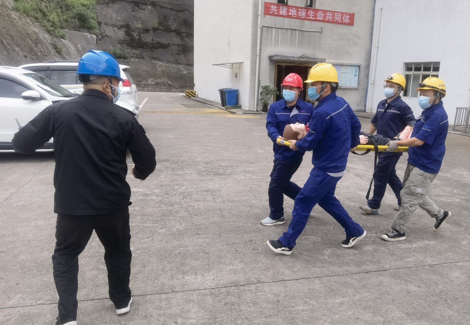 隨著總指揮一聲令下,演練正式開(kāi)始?!耙幻麊T工突然暈倒,情況不明”,接到指令后,總指揮立即啟動(dòng)有限空間作業(yè)現(xiàn)場(chǎng)應(yīng)急處置方案,各演練小組攜帶救援設(shè)備迅速到位,穿戴變壓式呼吸機(jī)進(jìn)入集水井將傷員救出,“傷員無(wú)外傷、無(wú)呼吸、無(wú)心跳”救援組對(duì)傷員情況作出基本判斷后立即實(shí)施心肺復(fù)蘇急救,用擔(dān)架轉(zhuǎn)移傷員至安全地帶,在119、120到達(dá)事故現(xiàn)場(chǎng)后,傷者移交120。各演練小組協(xié)同119對(duì)事故現(xiàn)場(chǎng)進(jìn)行后續(xù)檢查,無(wú)次生風(fēng)險(xiǎn)。