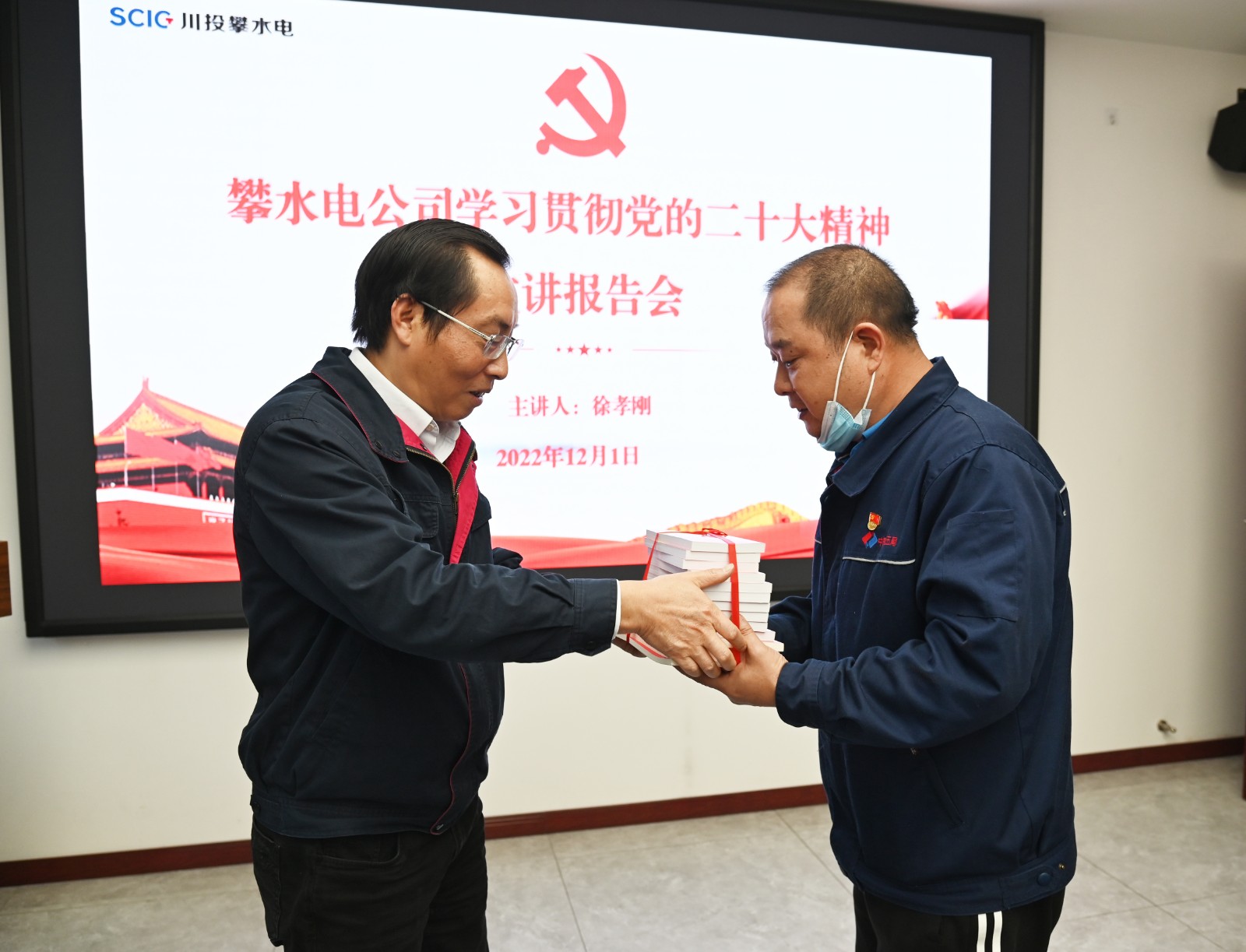 徐孝剛要求,要把廣泛開展面向職工群眾、一線工人宣講黨的二十大精神作為加強思想政治引領(lǐng)、廣泛凝聚民心的重要抓手,結(jié)合工程建設實際,切實確保黨的二十大精神宣講更有特色更有活力。要把學習貫徹黨的二十大精神與銀江水電站工程建設實際相結(jié)合,與工程建設重點任務、重要困難、重要目標節(jié)點等結(jié)合起來,高標準、嚴要求推進工程建設。宣講會后徐孝剛向水電五局項目部贈送了《黨的二十大文件匯編》口袋書、《黨的二十大報告學習輔導百問》《二十大黨章修正案問答》等書籍。