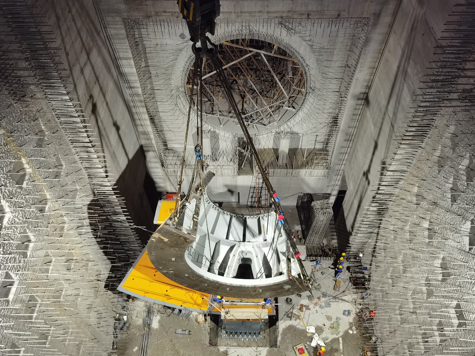 10月20日履帶吊車試吊驗(yàn)收及下固定導(dǎo)葉順利吊裝完成后,從20日16點(diǎn)開(kāi)始至21日20:00結(jié)束,歷經(jīng)運(yùn)輸、翻身及吊裝三個(gè)階段長(zhǎng)達(dá)18個(gè)小時(shí)工作,管形座最重件第一瓣內(nèi)殼在公司領(lǐng)導(dǎo)的現(xiàn)場(chǎng)指導(dǎo)下穩(wěn)穩(wěn)落至安裝位置,后續(xù)公司將組織參建單位一鼓作氣將首臺(tái)機(jī)組管形座剩余內(nèi)殼、外殼、前錐體及固定導(dǎo)葉等悉數(shù)吊裝到位,力爭(zhēng)年底完成安裝工作,為實(shí)現(xiàn)2025年一季度首臺(tái)機(jī)組投產(chǎn)發(fā)電目標(biāo)打下堅(jiān)實(shí)基礎(chǔ)。