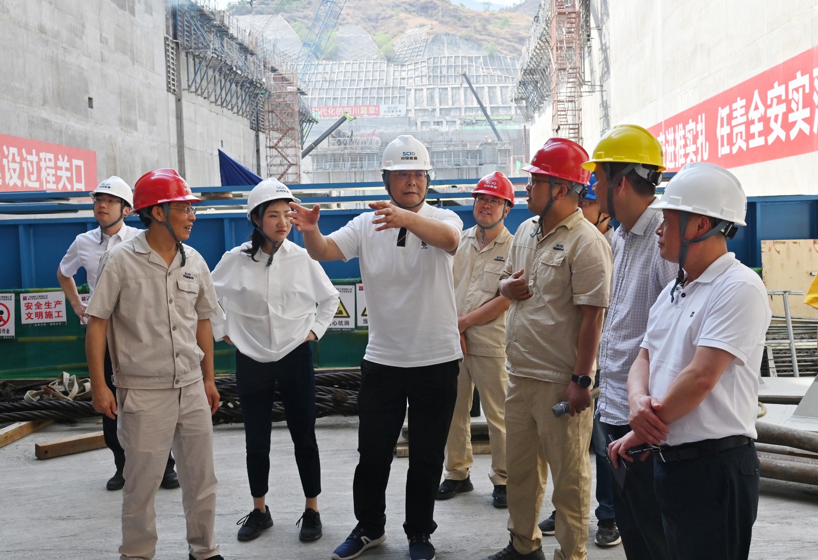 李文志一行來到銀江水電站施工現(xiàn)場,查看了廠房壩段、溢流壩段施工情況以及機(jī)組安裝情況,并聽取了攀水電公司關(guān)于工程建設(shè)、生產(chǎn)經(jīng)營、安全環(huán)保、黨建紀(jì)檢等工作情況匯報(bào)。