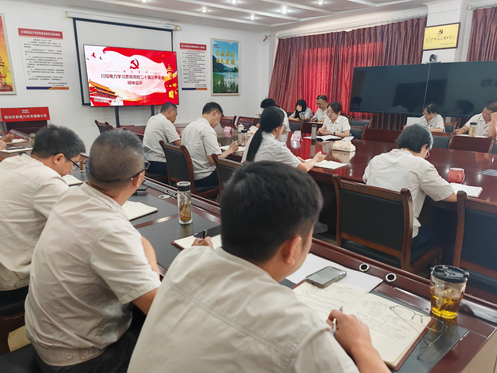 近日,川投電力黨委委員、紀委書記謝麗到天彭電力宣講黨的二十屆三中全會精神,引導廣大黨員干部進一步把思想和行動統(tǒng)一到黨中央決策部署上來,激發(fā)干事創(chuàng)業(yè)活力。天彭電力領(lǐng)導班子成員、黨員、干部、關(guān)鍵崗位人員參加宣講會。