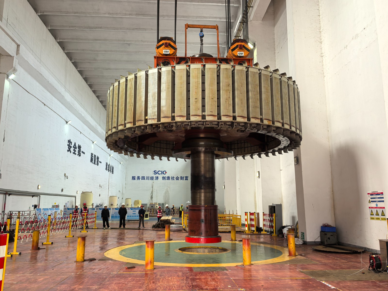 近日,經(jīng)過自主檢修團(tuán)隊(duì)的連續(xù)奮戰(zhàn),川投電力所屬百花灘電廠2號發(fā)電機(jī)組轉(zhuǎn)子順利吊出,標(biāo)志著此次檢修工作首個(gè)重大關(guān)鍵節(jié)點(diǎn)取得階段性勝利。川投電力黨委委員、副總經(jīng)理王偉,副總經(jīng)理陳云明及相關(guān)部門負(fù)責(zé)人現(xiàn)場指導(dǎo)工作。