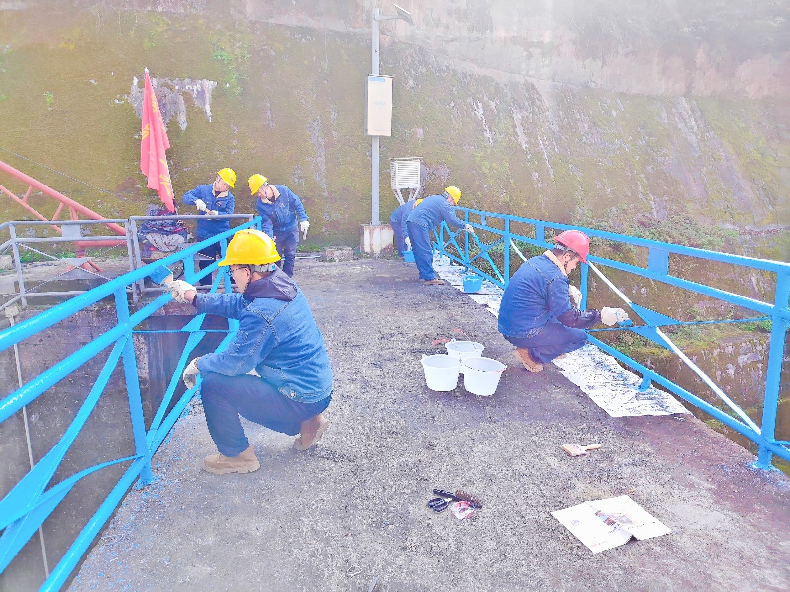 鳳鳴湖水庫是彭州市一級水源保護地。水庫大壩的護欄及金屬結構長期暴露于自然環(huán)境中,出現(xiàn)了不同程度的銹蝕脫漆現(xiàn)象,既影響大壩整體美觀,又對運行安全埋下隱患。為給大壩換上“新衣”,第三支部黨員擼起袖子迅速行動起來。