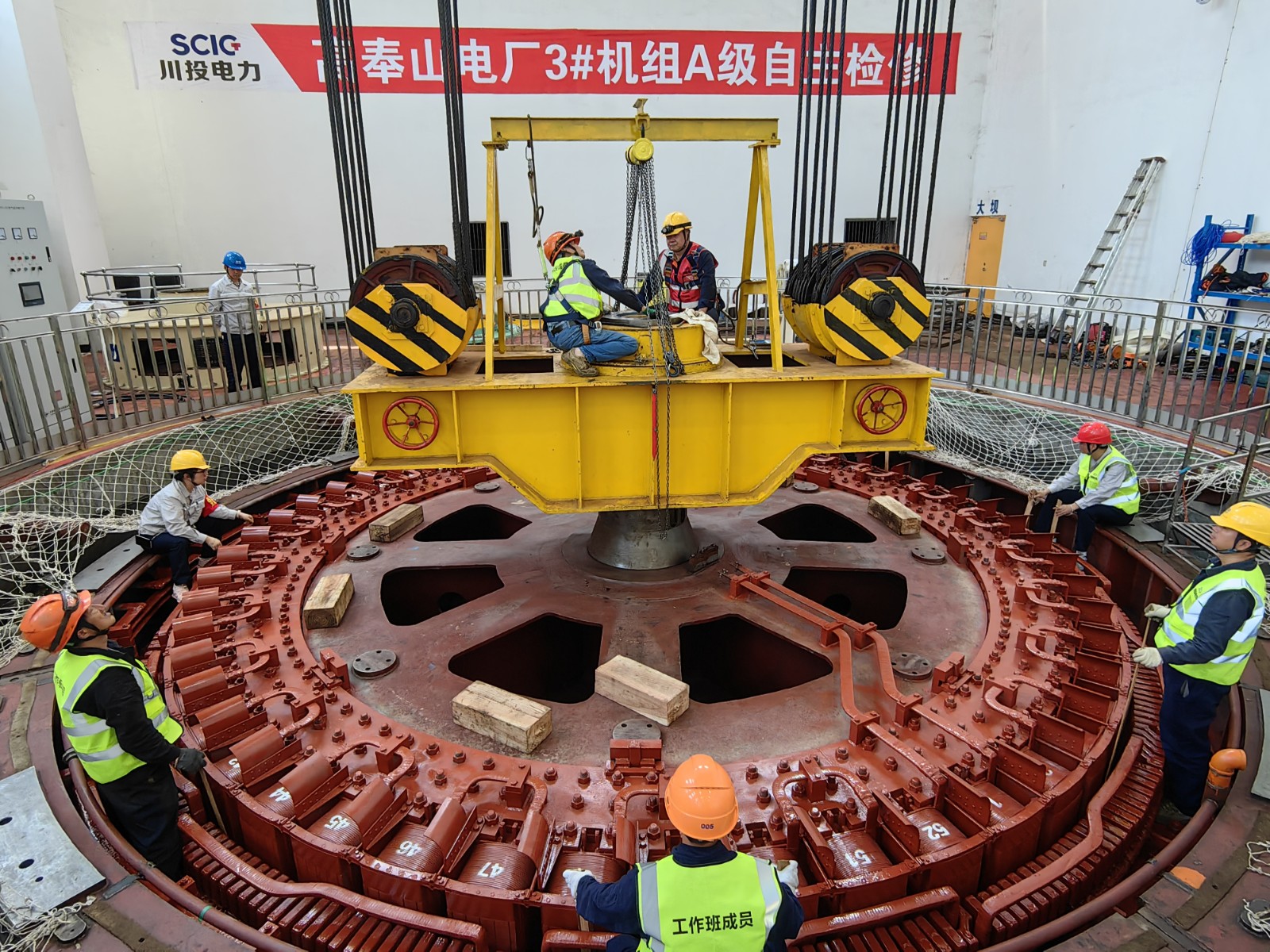 由于轉(zhuǎn)子與定子之間的間隙只有12毫米,要把這兩個(gè)“大家伙”精準(zhǔn)送回機(jī)坑指定位置并安裝好,難度系數(shù)非常高。川投電力高度重視,上下聯(lián)動(dòng),周密部署,全鏈條壓實(shí)安全生產(chǎn)責(zé)任,確保轉(zhuǎn)子回裝工作萬無一失。
